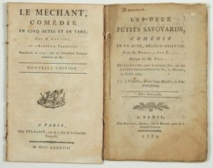 COMÉDIE. 2 Pièces imprimées: «LE MÉCHANT, COMÉDIE en cinq actes et en vers par M. GRESSET de l'Académie française, représentée en 1747, par les comédiens Français ordinaires du Roi. Nouvelle édition - Impr. à Paris chez Delalain, rue & à coté de la Comédie Française, 1788 - (dérelié) - 60pp in-8° + « LES DEUX PETITS SAVOYARDS, Comédie en un acte, mêlée d'ariettes par M. Mars... des V... Représentée, pour la première fois, par les Comédiens Italiens ordinaires du Roi, le Mercredi 14 Janvier 1789 - Impr. à Paris, chez Brunet, rue de Marivaux, Place de la Comédie Italienne.» 1789, 70pp in-8°.