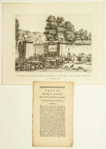 LAMBESC (Charles de LORRAINE, prince de) 1751-1825 “Le Sabreur des Tuileries” - “PRÉCIS HISTORIQUE et justificatif de Charles-Eugène de LORRAINE, PRINCE de LAMBESC.” - Trèves 1er Mai 1790 - Plaquette imprimée 8 pp in-8° - On joint: GRAVURE de Prieur & Berthault sculp. N° 16: Le Régiment Royal-Allemand entrant aux Tuileries, par le pont tournant, le 12 janvier 1789, (et charge la foule) - (25 x 30) -