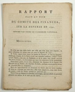 RÉVOLUTION, LES FINANCES DE LA FRANCE en 1791: «RAPPORT fait au nom du Comité des Finances, sur la dépense de 1791, imprimé par ordre de l'Assemblée Nationale.» - Imprimé de 19 pages in-4°. (Maison du Roi, Maison des Princes, Culte, Guerre, Marine, Affaires étrangères...)