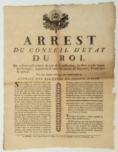DOUANE. 1781. FERS. ILLE-ET-VILAINE. Placard (46 x 35) «Arrêt du Conseil d'État du Roi, qui ordonne qu'à compter de la publication, les Fers en tôle venant de l'Étranger, acquitteront à toutes les entrées du Royaume, Trente sous du quintal.» Du 11 Janvier 1781. Publié par CAZE, Baron de la BOVE, Intendant de Bretagne., à RENNES 1781. Impr. à RENNES (35), Chez la Veuve François VATAR, Imprimeur du Roi et du Parlement, 1781. Etat B+