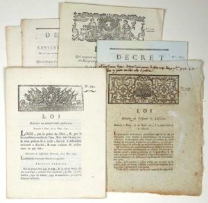 6 LOIS ET DÉCRETS SUR LA JUSTICE. (1791/An 2): 27 Mars 1791: Loi relative au NOUVEL ORDRE JUDICIAIRE. 3 Signatures autographes à SAINTES le 21 Mai 1791 dont le Conventionnel René ESCHASSERIAUX ; Loi du 18 août 1792, qui suspend de leurs fonctions les Commissaires du Roi près les Tribunaux civils et criminels ; Loi du 19 août 1792 relative au TRIBUNAL DE CASSATION, griffe de DANTON et Cachet ; Décret du 13 brumaire an 2, qui prononce la peine de mort contre les geôliers et gardiens, convaincus d'avoir favorisé l'évasion des personnes détenues. Du 22 Brumaire An 2: Exécution des articles d'appendice du CODE CIVIL. Du 26 Brumaire an 2: Toutes les Personnes détenues dans les Maisons d'arrêt, auront la même nourriture.