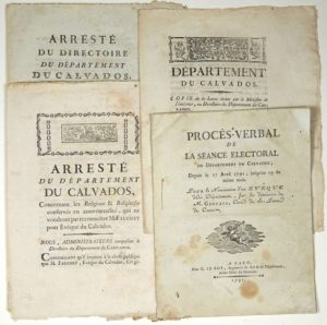 CALVADOS. PRÊTRES CONSTITUTIONNELS. 4 Imprimées à CAEN en 1791: 1) Procès-verbal de la Séance Électorale du Départ. du Calvados, depuis le 17 au 19 avril 1791, pour la Nomination d'un ÉVÊQUE dudit Département, sur la démission de M. GERVAIS, curé de St-Pierre de CAEN. Vignette - imp. 20 pp in-4° + 2) Arrêté du Départ. du Calvados, concernant les Religieux & Religieuses conservés en conventualité, qui ne voudront pas reconnaître M. FAUCHET pour Évêque du Calvados. 16 juillet 1791. imp. 3pp in-4° + 3) Arrêté du Directoire du Départ. du Calvados, concernant l'Arrestation des Ecclésiastiques Fonctionnaires publics non-Sermentés. 20 août 1791. 6pp in-4° + 4) Département du Calvados. Copie de la Lettre écrite par le Ministre de l'intérieur, au Directoire du département du Calvados. Paris 8 oct. 1791 - “Il parait, MM., qu'on cherche toujours à inquiéter les Prêtres non conformistes, à Caen, & qu'on veut les empêcher de dire la Messe dans les Églises Paroissiales & dans les Oratoires publics...” Impr. 3pp in-4°.