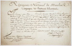 ALLIER. 1791. «RÉGIMENT NATIONAL DE MOULINS.» Certificat de service militaire signée du Conseil de la Compagnie des CHASSEURS VOLONTAIRES audit Régiment, donné à MOULINS (03) le 27 Septembre 1791. Certificat délivré au Sieur MODÉRAT, Chasseur Volontaire, natif de MOULINS (Allier), âgé de 20 ans, lequel y a servi avec Honneur et probité. Jean Louis BODINAT DE LA MOTTE est Colonel Commandant le Régiment National de Moulins. Brevet (23 x 36,5 cm)