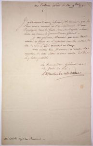 Louis-Hercule Timoléon de COSSÉ-BRISSAC Duc de BRISSAC (Paris 1734 - Assassiné à Versailles le 9 sept. 1792.) Grand panetier de France, Capitaine-colonel des Cent-Suisses de la Garde du Roi, Maréchal de Camp en 1780, Gouverneur de Paris (1775-1791) puis Commandant en Chef de a Garde Constitutionnelle du Roi Louis XVI (1791) - Lettre Signée «L.H. Timoléon de Cossé Brissac» Le Commandant Général de la Garde du Roi. aux Tuileries à Paris le 30 Sept 1791. À M. CORIOLIS Capitaine dans le Régiment BOURBONNAIS. Il l'informe que le Roi l'a nommé au Commandement d'une Compagnie dans sa Garde, «dont Sa Majesté a bien voulu me donner le Commandement Général. Je vous préviens, Monsieur, que vous êtes attaché au Corps de l'Infanterie sous les ordres de M. de Pont L'Abbé Maréchal de Camp...». 1p in-folio.