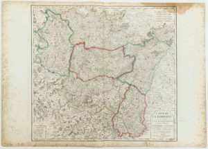 CARTE de 1792: «Carte de LA LORRAINE où l'on a distingué le Pays Messin, le Verdunois, et le Toulois ; le Barrois et l'Alsace, avec les routes, les anciennes Divisions et les nouvelles en Départements. Par C.F. DELAMARCHE Géographe et successeur de Robert de Vaugondy. A Paris chez l'auteur, rue du Foin St Jacques, 1792. (Langres, Verdun, Metz, Nancy, Strasbourg, Epinal, Colmar...) (54 x 76 cm) Etat B. Tache sur un bord et rousseurs.