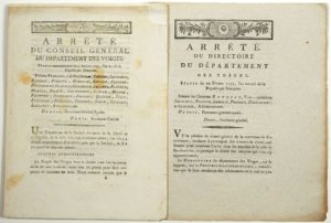 VOSGES. 2 Imprimés: «Arrêté du Conseil Général du Département des VOSGES, Séance du 3 Janvier 1793”, concernant La Société Populaire d'ÉPINAL - Impr. à ÉPINAL, 12pp in-4°:  «Une députation de la Société des Amis de la Liberté et de l'Égalité, a été introduite; l'un d'eux à donné connaissance d'un arrêté pris par la Société, et il a prononcé le discours suivant: Le Peuple des VOSGES vous a choisi pour être les instruments de votre bonheur... suit l'Extrait du Procès-Verbal des Séances de la Société des Amis de la Liberté et de l'Égalité, séante à ÉPINAL.”, “ADRESSE des Citoyens d'ÉPINAL réunis en Société des Amis de la Liberté et de l'Égalité, à la Convention Nationale.”, “Réponse du Président du Département, à la Députation de la Société des Amis de la Liberté et de l'Égalité, d'ÉPINAL.» + «Arrêté du Directoire du Départ. des VOSGES, Séance du 22 Février 1793 - Concernant le Marché de RAMBERVILLERS.» - Impr. à ÉPINAL, 3pp in-4° - “Vu la pétition du Conseil Général de REMIREMONT, tendante à provoquer des mesures de sûreté, suffisantes pour maintenir l'ordre dans les Marchés de la Ville de RAMBERVILLERS (Remberviller), et protéger la sûreté des citoyens qui vont s'y approvisionnent. Bandeau.