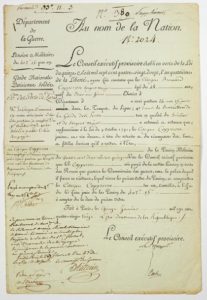 «BUREAU DES PORTS DE PARIS. GARDE NATIONALE PARISIENNE SOLDÉE». Pièce Signée LEBRUN-TONDU Président & PACHE, membres du Conseil exécutif provisoire. Paris le 15 Janvier 1793 - Pension Militaire pour Bernard CAPPERON Sergent-Major, 24 ans de service dans les Troupes de ligne et dans le Bataillon de la Garde des ports - 1p in-folio en partie imp. - LEBRUN-TONDU (Pierre-Marie-Henry Tondu dit) Imprimeur et Ministre, Président de quinzaine du Conseil Exécutif lors de l'exécution du Roi Louis XVI, eut à signer cet ordre, le 20 janvier 1793 - PACHE (Jean-Nicolas) Ministre de la guerre du 18 oct. 1792 au 2 fév. 1793, Maire de Paris