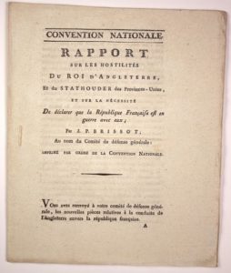 DÉCLARATION DE GUERRE AVEC L'ANGLETERRE ET LES PAYS-BAS. Février 1793. «Rapport sur les Hostilités du Roi d'Angleterre, et du Stathouder des Provinces-Unies, et sur la nécessité de déclarer que la république Française est en guerre avec eux ; par J.P. BRISSOT ; au Nom du Comité de défense générale: Imprimé par ordre de la Convention Nationale.» - Imprimé à SAINTES (17) chez P. Toussaints, Impr. du Département de la Charente inférieure. 1793 ; 14pp in-4°.
