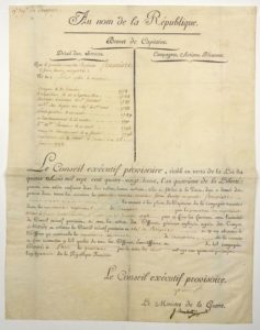 BREVET DE CAPITAINE dans le 9° RÉGIMENT DE DRAGONS délivré au Quartier-Maître Trésorier J. Henry FRANCIERE, né à AMIENS (80), donné à Paris le 4 mai 1793 - Vélin en partie imp. (31,5 x 41) - Pièce signée BOUCHOTTE (Griffe) Ministre de la Guerre, et GARAT pour le conseil Exécutif - Détail des Services de 1778 à 1793.