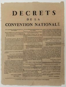 ILLE-ET-VILAINE. Décrets de la CONVENTION NATIONALE: 1°) Relatif aux Militaires qui se permettraient des propos tendant à exciter du trouble & à empêcher l'incorporation des Citoyens de la première Réquisition dans les anciens Cadres.» du 1er Nivôse An 2 (21 Décembre 1793) ; 2°) Relatifs aux délais fixés aux Créanciers des Emigrés pour la remise de leurs Titres. Du 6 Pluviôse An 2 ; 3°) Relatifs à la continuation des poursuites intentées en réparation de dommages, contre le Régisseur et ses Préposés. Du 13 Pluviôse An 2. Impr. à RENNES (35), chez la Veuve de François VATAR & de BRUTÉ. Placard (52 x 40) Etat A