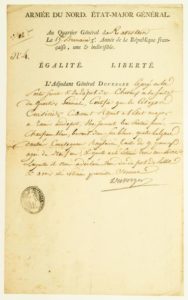 ARMÉE DU NORD. Certificat signé du Général Alexis-Jean-Henri DUVERGER (Étampes 91/Seine et Oise 1755 - 1830) en tant qu'Adjudant Général chargé de la partie Secrète & du dépôt des Chevaux à la suite du Quartier Général (Son en-tête imprimé) - Au Q.G. de RAVESTEIN (Pays-Bas), le 15 Brumaire an 3 (1794) - 1p in-folio, cachet noir. «.. Certifie que le Citoyen CUISISIS ci-devant Adjoint à l'État major a remis au dépôt, une jument bai châtain foncé, chanfrein blanc, buvant dans son blanc, quatre balzanes dentées, courtequeue anglaisée, taille 9 pour 1/2 âgée de 9 ans,.. estimée 300 Livres...»