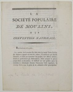 (ALLIER) Adresse Imprimée de la SOCIÉTÉ POPULAIRE DE MOULINS à la Convention Nationale (en …