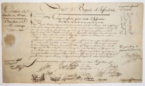 «ARMÉE DE SAMBRE ET MEUSE. Division de MONTAIGU.» Congé militaire signé des Généraux Anne Charles Basset de MONTAIGU, Louis THORY & Pierre Charles DUMOULIN et du Conseil de la 162 ½ Brigade d'Infanterie. Fait à OSSUM 19 Frimaire an 3 (3 Déc. 1794). Congé de réforme pour André FAUCHEUX, ci-devant Sergent. Certifions qu'il a été grièvement blessé à l'Affaire de FAMARS en 1793 (Vieux Style), en combattant les Satellites des Tyrans, estropié, a été au Siège de Valenciennes. Brevet (21,5 x 37 cm)