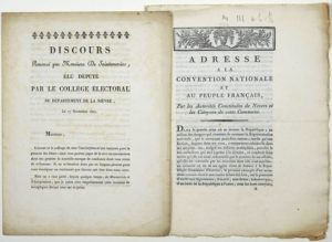 NIÈVRE. 2 Imprimés: «Adresse à la CONVENTION NATIONALE et au Peuple Français, par les Autorités Constituées de NEVERS et les Citoyens de cette Commune.» - Impr. à NEVERS, de l'Imprimerie de J. Lefebvre l'ainé, impr. du Département. Prairial An 3 (Juin 1795) ; 8pp in-4°, Bandeau + “DISCOURS prononcé par Mr De SAINTEMARIE Élu DÉPUTÉ par le Collège Électoral du Départ de la NIÈVRE, le 27 novembre 1827.” “L'ESTIME et le suffrage de mes concitoyens m'ont toujours paru le premier des biens... J'aime la Charte et les Institutions.. J'aime le Roi et la Patrie.. VIVE LE ROI!” - Impr. à NEVERS, chez LEFEBVRE (le Jeune), rue des Récollets ; 3pp in-4°.