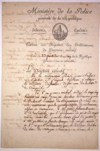 (RADIATION DE LE PELLETIER SAINT FARGEAU DE LA LISTE DES ÉMIGRÉS.) SOTIN DE LA COINDIERE Pierre Jean Marie (Nantes 1764- La Chevrolière 1810) Diplomate & Ministre français - Lettre signée comme Ministre de la Police à l'en-tête impr. du Ministère de la Police sur l'Extrait des registres des Délibérations du Directoire exécutif qui certifie conforme l'Arrêté permettant la Radiation du Nom de Félix LE PELLETIER SAINT FARGEAU propriétaire à Versailles de la Liste des Émigrés ainsi que la levée des séquestres sur tous ses biens - PARIS 23 fructidor an 5 (9 Sept. 1797) - 3pp in folio avec cachet et vignette. [LE PELLETIER SAINT FARGEAU Félix (1769-1837) Publiciste et homme Politique français, frère du Conventionnel assassiné à PARIS en 1793. Il était Aide-de-camp du Prince de LAMBESC avant de donner sa démission le 3 juillet 1789. Fervent défenseur de la démocratie qu'il défendit du 9 Thermidor au 18 Brumaire ; il fut impliqué dans l'affaire BABEUF et compris dans la liste de ceux qui devaient être déportés aux îles SECHELLES, avant d'être acquitté].