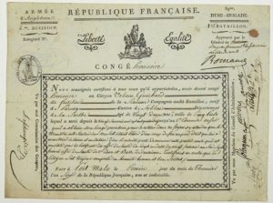 SAINT-MALO (35). ARMÉE D'ANGLETERRE, 89° Demi-Brigade - Pièce signée du Général ROMAND Commandant la Subdivision des CÔTES DU NORD - CONGÉ provisoire délivré au Citoyen Urbain GUICHARD dit Fusilier, natif de PARCAY Canton de SABLAIS (Sarthe) blessé d'un coup de feu. Il s'est toujours comporté en honnête homme et bon soldat. Fait à PORT MALO (Nom révolutionnaire de SAINT-MALO) le 1er Thermidor An 6 (19 Juillet 1798) - 1p in-folio oblong, en partie gravée - (ROMAND (Balthazar) Grenoble 1749 - Angers 1811 - il fut Général en 1795, Commandant à Belle Isle en Mer). Etat A.