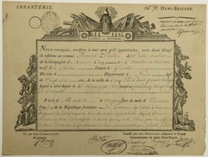 BOUCHES-DU-RHÔNE. 1798. Congé militaire signé du Général Pierre QUANTIN et du Conseil de la 34e /2 Brigade d'Infanterie. Fait à MARSEILLE (13) 27 thermidor An 6 (14 Août 1798). Congé de réforme au Fusilier François POULET, natif de l'Isère. «Il a servi avec honneur.» Brevet gravé (24 x 32 cm) rempli à l'encre. Décoré de soldats.