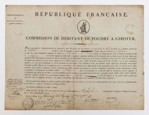 BELGIQUE. 1799. NAMUR (Département de la Dyle.). Commission de débitant de POUDRE A GIBOYER dans la Commune de NAMUR délivré à ANDRÉ. Pièce signée des Administrateurs des Poudres et Salpêtres de la République Française: A. BOTTÉE & DUCAMP, Fait à Paris 9 Pluviôse An 7 (28 Janvier 1799). Visé à la Mairie de NAMUR. Diplôme gravé (33 x 43 cm), rempli à l'encre.