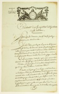 ILLE ET VILAINE, Grande Vignette du Département. “Extrait des Registres du Département d'ILLE & VILAINE, Séance du 4 brumaire an 8 (26 Oct. 1799) - 1p1/2 grand in-folio - 2 signatures - cachet - Vu la pétition de la Commune de Saint-Didier contre l'amende de 1500 Frs en raison de l'Assassinat commis en la personne du Citoyen Besnard... “arrête dans le cas où la somme ne serait pas soldée..., les grains et bestiaux qui seront enlevés par la force armée en remplacement du numéraire effectif seront conduits à Chateaugiron pour y être mis... à la disposition des subsistances militaires...”