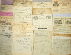 LILLE (59) COLLECTION de 46 FACTURES DE LILLE de l'an 9 (1801) à 1905, Presque toutes différentes, et 6 Lettres de Changes de commerçants de LILLE. qqs défauts: DEFOSSEUX-VIRNOT, vente et livraison de marchandises, à Lille An 9 + BAUDECHON, livraison de sacs de fleurs, payable en écus, Lille An 10 + FROMONT-RIQUIER Md Ébéniste et Marbrier, 61 rue Esquermoise à Lille 1818 + DANEL, Imprimeur du roi et Libraire, à Lille 1819 + CAUVAIN-GÉRIN Fabricant de toiles et sarraux, rue de Paris, N°81, Lille 1822 + «AU GLAND D'OR» CORBEL- DESNOYELLE, 3 rue des prêtres Lille 1824 + VIDAL & Cie Toiles, 10 rue Neuve, Lille 1837 + Fabrique de CARDES, SCRIVE Frères, à Lille 1838 + Plomberie de DESPLANQUES, 4 Place du Château à Lille 1855 + CHOCQUET-PIGNATEL Fils 13 place aux Bleuets à Lille 1860 + REVILLE 1 DARTOUT Fabriques de Tulles en tous genres, 5 rue d'Amiens Lille 1868 + BERNARD & DEVOS, Toiles et Sarraux, 95 rue de Paris Lille 1871 + MEUNIER-STERLIN, fabrique de toiles à HALLUIN, Maison d'expédition 16 rue de Moline Lille 1871 + BENOIT-PRUVOST Bonneterie, Ganterie, 19 rue de Grande-Chaussée à Lille 1875 + VRAU & Cie Fils de lin à coudre, Manufacturiers à Lille 1876 + ORLIAC & BONNEL Entreprise de transports, 2 rue des trois mollettes Lille 1876 + WICARD Frères, Tissage de toiles et damassés, 246 rue de Paris Lille 1879 + DUPONT Produit chimiques et pharmaceutiques, 130 Bld de la Liberté Lille 1897 + STIEVENARD-THOMAS Laines à matelas, 1 rue du Pont-à-Raines Lille 1899 + Brasserie MASSE-MEURISSE 112 rue de la Barre Lille 1904 + CREPIN Manufacture de confections, 92 rue du Port Lille 1905.