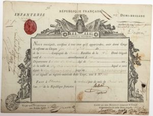 ALEXANDRIE (Italie) 17 prairial An 9 (6 Juin 1801). Congé militaire signé des Généraux Antoine DELMAS, en tant que Lieutenant-Général Commandant en PIÉMONT et Jean DAVIN Commandant le Département de MARENGO & du Conseil de la 75e Demi-Brigade d'Infanterie. Congé de réforme au Citoyen Yves LANCIEN Fusilier de la Compagnie. Brevet gravé (25 x 33 cm) renseigné à l'encre, décoré de soldats.