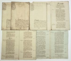 DE WARENGHIEN, Noble Famille de Flandres. MINES DE CHARBON D'ANICHE (Nord). 7 LIVRES DE COMPTES, truffés de quittances: Comptes de la Dame DE WARENGHIEN Veuve de Mr LE BOUCQ, tant des revenus de ses biens que de ceux des successions de Mr le Chanoine DE WARENGHIEN et Mr DE WARENGHIEN DE LASSUS ses frères pour les Années 1802, 1803, 1804, 1806 et 1807, 1808, 1809, et 1810. Baux des Mineurs de Charbon des Mines d'Aniche (Nord), Fermage des Laboureurs, cabaretiers, à Vred, Montigny, Aniche, Aniche et Auberchicourt (59), et Courrières (62), Lallaing (59), Sin, Marchiennes(59), Bouvignies (59), Landas (59).