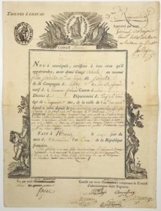 TROUPES À CHEVAL. NIÈVRE. 2ème Régiment de CAVALERIE. Congé absolu pour Félix SANITA Maréchal des Logis, natif de Clermont-Ferrand (63), lequel a servi de 1787, fait Brigadier en 1792, Maréchal des Logis en 1793, jusqu'au jour qu'il a obtenu le présent congé pour passer à l'école de Musique militaire établie à Versailles. Fait à NEVERS (58) le 16 Thermidor An 10 (4 Août 1802). Congé signé du Général de Brigade Charles SALLIGNY DE SAN GERMANO (1772-1809) Commandant le Département de la Nièvre, du Général Gabriel de SOMBS DE FAJAC Sous-Inspecteur aux Revues, et du Chef de Brigade Ythier Silvain PRYVÉ (Général en 1807) - Grand certificat gravé, rempli à l'encre (33 x 24,5 cm).