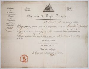 LOT. 1803. JUSTICE - Grand Brevet délivré par le Bureau de l'Organisation de l'Ordre Judiciaire le 25 Pluviôse An 11 (14 Février 1803): “BONAPARTE Premier Consul” (Entête, vignette) - Nomination de Jean Pierre MAINARD pour remplir les fonctions de Greffier de la Justice de Paix du Canton de FIGEAC. Pièce signée REGNIER Le Grand Juge Ministre de la Justice - 1p (33 x 44) oblong.