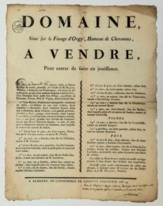 YONNE. «DOMAINE situé sur le finage d'ORGY, Hameau de CHEVANNES (89), à vendre, pour entrer en suite en jouissance.» 26 Janvier 1806. Impr. à AUXERRE (89), chez Laurent Fournier, An 14. Affiche timbrée (47 x 36 cm) Etat B+