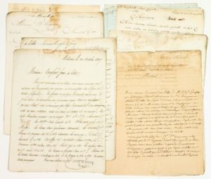 DENRÉES COLONIALES. Maison «LENGLARD Frères» à LILLE (Nord). 21 LETTRES commerciales adressées à LENGLARD Frères à LILLE, commissionnaires en denrées coloniales et autres denrées: 3 Lettres de BORDEAUX (33) de 1807. «Nous venons vous instruire des changements qui viennent de se manifester sur le cours des denrées coloniales ; la Capture de quelques bâtiments Américains & plus encore les dispositions qui paraissent régner tant en Angleterre qu'aux États-Unis n'annoncent que trop l'impossibilité d'un arrangement entre ces deux nations.» Les cafés Bourbons et les Havanes, et les sucres augmentent. Lettres de NANTES (44) de 1822 et 1823: «Le cours des sucres brutes se maintient sur les places...» Lettres de LILLE (59) et d'ORLÉANS (45) de 1806.