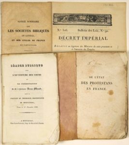 PROTESTANTISME. 4 Imprimés: Décret Impérial du 5 mai 1806, relatif au logement des Ministres du Culte protestant et à l'entretien des Temples. Bandeau, 1p in-4° + “DE L'ÉTAT DES PROTESTANTS EN FRANCE, depuis le XVIe Siècle jusqu'à nos jours, avec des notes et éclaircissement Historiques; par M. Aignan, de l'Académie Française. - 1818 - Paris, Imprimerie de Fain, place de l'Odéon - 132 pp in-8° + «Notice sommaire sur LES SOCIÉTÉS BIBLIQUES en général, et sur celles de France en particulier.» - Janvier 1825 - (Comité d'Administration de la Société Biblique Protestante de PARIS au 1er Janvier 1825 ; Liste des Sociétés Bibliques de France ; Sociétés Bibliques de Femmes ; Associations Bibliques ; Catalogue des Bibles et Nouveaux-testaments avec le tarif des prix - De l'Imprimerie de J. SMITH, Rue de Montmorency, N°16 + “Séance publique pour l'Ouverture des Cours et la Présentation de M. le Professeur Adolphe MONOD dans la Faculté de Théologie Protestante de MONTAUBAN, tenue le 17 Novembre 1836 - Impr. à MONTAUBAN, chez LAPIE-FONTANEL, Imp. du Roi et de la Faculté, 40 pp in-8°.