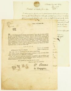 TABAC DE VIRGINIE. CORSAIRE «LA REVANCHE» de BOULOGNE (Pas-de-Calais). 2 Lettres et 1 Imprimé: L'Imprimé daté de CALAIS (62) le 23 Juillet 1808, annonce la Vente de la cargaison du Navire Américain THE BROTHERS, capturé dans sa traversée de Petersbourg en Virginie à Londres, par le Corsaire LA REVANCHE, de Boulogne, de 246 boucauds de Tabac de la Virginie, en présence du receveur principal des Douanes Impériales. Suit une Lettre de Calais du 6 Août 1808, prévenant M. LE CAVELIER fils de Caen, Négociant de tabac, de cette vente aux enchères. Une autre Lettre de MORLAIX du 9 Mai 1808, informe LE CAVELIER fils, du résultat d'une autre vente aux enchères de Tabac qui a lieu à Roscoff en mai 1808.
