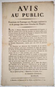 EMPIRE. 1810. Avis au public pour la FOURNITURE DE FOURRAGES AUX TROUPES stationnées et de …