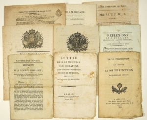 RESTAURATION. 10 imprimés: «Réflexions de M. BERGASSE, Ancien Député à l'Assemblée Constituante, sur l'Acte Constitutionnel du Sénat. (1814). Impr. 16pp in-8° + «Lettre à M. BERGASSE, au sujet de ses réflexions sur l'acte Constitutionnel. Paris 25 avril 1814. De l'Imprimerie de Crapelet, rue de Vaugirard, N°9, près l'Odéon, 8pp in-8° + «Ordonnance du Roi. Paris 10 mai 1814. Extrait du Moniteur. De l'Imprimerie d'Aubry, au Palais de Justice, N°37 ; 4pp in-4° + «Extrait du Moniteur du Mercredi 18 Mai 1814. Ordonnance de Louis XVIII. De l'Imprimerie de L.P. Sétier fils, Cloitre St-Benoit. ; 2pp in-4° + «Ordonnance du Roi. Paris 5 Juillet 1814. Extrait du Moniteur. De l'Imprimerie de Chaigniau Ainé, rue de la monnaie, N°11 ; 4pp in-4° + «Garde Nationale de PARIS. Ordre du jour du 8 juillet 1815. Comte DESSOLLE Général.» De l'Imprimerie de DIDOT L'Ainé, Imprimeur du Roi et des Gardes Nationales de France ; 2pp in-4° + «- Lettre de M. le Maréchal de RAGUSE (MARMONT), à son Excellence le Duc de RICHELIEU, président du Conseil des Ministres, juillet 1818» Impr. à Paris, chez DIDOT Ainé, Imprimeur du Roi + «De la proposition de changer la Loi des Élections, pat M. BENJAMIN CONSTANT, 1819.» Impr. à Grenoble, chez David, impr. 8pp in-8° + «Séance complète du COMITÉ SECRET de la Chambre des députés tenu le 26 novembre 1821. Monument historique.» - Impr. à Paris, Corréard, Libraire, Palais-Royal ; 1821: 19pp in-8° + «Opinion de M. le Général DONNADIEU, 5 décembre 1821» impr. 8pp in-8°.