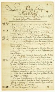 FAUSSE MONNAIE. Manuscrit intitulé «LOUIS DE FAUSSE FABRIQUE» «Tableau indicatif des signes qui distinguent les Louis (ou pièces de 24 Livres) de fausse fabrique d'avec les Bons.» Manuscrit Empire de 4 pages in-folio complété et augmenté en Septembre 1818 et 1820. Tableau qui commence en 1784 pour finir en 1820.