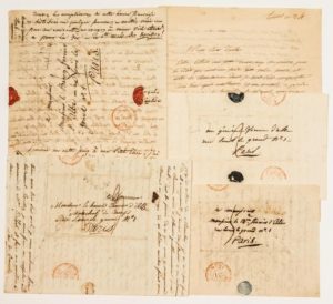 Baron Gaspard FORNIER D'ALBE (Nîmes (Gard) 1769 - 1834) Général. 5 Lettres amicales ou familiales à lui adressées à Paris de 1819 à 1825 (Il est à la retraite en 1818): Deux Lettres A.S. du Comte Malo PICAULT DES DORIDES (Né à Saint Malo en 1789), Une d'Inès de GENESTE., et les autres de Famille.