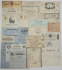 23 FACTURES DE PARIS: Paris 181? «Au Soleil et à la Gerbe d'Or», 49 Quai de l'Horloge, Marchands Lunetiers Opticiens + Paris 1816. «A l'Espérance» 140 rue Saint-Honoré, FRAMBERT, Tient Magasin de Boutons en tous genres + Paris 1819. Louis LOQUE, Breveté pour la Fabrication des Lampes Ignifères + Paris 1821, DOCHE Bottier, 24 Rue Vivienne + Paris 1821 MASSU Frères 129 rue St Denis, tiennent Magasin de gants en gros + Paris 1824 QUILLET, Manufacture de lampes à double courant d'air + Paris 1834 «A La Providence» 106 rue de la Harpe, GUÉNOT, Marchand Grainier + Paris 1840, GUERIN DU ROI Ancien Pharmacien, 19 rue de la Monnaie + FROMENT-MEURICE, Orfèvre-Joaillier de la Ville de Paris, 372 rue St Honoré + Paris 1838. «A la Ville de Milan» 13 rue Vivienne Melle LAPOSTOLLE ainée, tien Magasin de tulles, satin, velours + Paris 1825. COMPAIN Lampiste, Breveté du Roi, de S.A.R. Madame et des princes + Paris 1837, BIAIS Ainé Chasublier-Brodeur, rue du Pot-de-Fer st Sulpice N°4 + Paris 1851, AUBERT & Cie, Place de la Bourse, Modèles, caricatures, Dessins pour les Fabricants + Paris 1857,Madame GASTALDI, Dépôt de dentelles, broderies, lingeries, 52 rue de la Madeleine + Paris 1857 HORRER & SANTERRE, 146 Rue Montmartre, Fabrique de dentelles et de blondes + Paris 1857, «A Jean de Paris», 4 rue du Bac, RAYNAUD & cie, Dentelles, cachemires + Paris 1858 «A l'Amazone» Paris 1858 DELALLÉE & Cie Tailleurs + Paris 1862, «A la Châtelaine» 34 rue du Bac, Fabrique de passementerie + Paris 1863, Maison DASSIER Passementier militaire de S.M. l'Empereur, 12 rue de Richelieu + Paris 1862, SIGNAC & Fils, Fabrique de Magasin de Sellerie + SUSSE Frères, Fabrique de pendules & bronzes d'art, 31 Place de la Bourse, Paris 1863 + VILLIERMOT, «À LA SYLPHIDE», Fabrique spéciale de Cols Cravates, Nouveautés en soieries pour cravates de fantaisie, 9 rue Le Pelletier, Paris 1864 + Paris 1867Grands Magasins du Louvre, rue de Rivoli