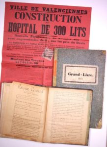 NORD. 1828. HOSPICES CIVILS DE VALENCIENNES, 5 rue des Hospices à Valenciennes. 2 Registres et une Affiche: Grand-Livre de comptes de 1828 dont est chargé M. Lecocq Lafontaine receveur des Hospices et du Bureau de Bienfaisance de Valenciennes. + Registre des lettres adressées à l'Hospice et écrites par lui: Copies carbone des lettres sur papiers pelure avec répertoire en fin de registre du 10 Février 1931 au 15 Janvier 1932. (Hospice général, Hôtel-Dieu, Nouvel Hôtel-Dieu, Hôtellerie, Chartriers, Hospice-Militaire, Hospices réunis.) + Affiche timbrée (60 x 42): «Ville de Valenciennes. Construction d'un Hôpital de 300 Lits. Nouvelle adjudication des travaux.» Valenciennes le 22 Juin 1913.