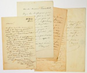 CHAPSAL (Charles Pierre) Grammairien (Paris 1788 - 1858) Sa Nouvelle grammaire mise en usage dans tous les Collèges régna longtemps sans rivale. Il en a été fait plus de 60 Éditions, sans compter les contrefaçons nombreuses. 3 Lettres A.S. à Mr SAINTIN, Imprimeur Rue St Jacques N°38 à PARIS - 1836: “Vous avez dû recevoir avec 45 ou 50 rames de papier un effet de 300 francs, trois mots nouvelle, 2 griffes et 2 têtes. Je pense que vous vous occupez de continuer le Tirage dont il y a eu 8000 de tirés, et que vous avons donné des ordres pour que les Tableaux soient recomposés. Il est indispensable que les caractères de ces tableaux ainsi que leur composition soient absolument semblables à la composition et aux caractères des Tableaux actuellement existantes. Cette conformité est nécessaire c'est-à-dire indispensable pour faire distinguer la bonne Édition des Éditions contrefaites. Vous recevrez lundi ou mardi la quantité de papier nécessaire pour compléter 100 Rames. Je vous prie de ne pas ralentir un instant mon Tirage, et de ne pas perdre de vue que vous devez faire immédiatement après un autre tirage de 25000.” - Je vous ai fait expédier 1300 Grammaires à 75, 130 Abrégés à 50, 26 Dictionnaires, 13 exercices sur les pratiques. Quand je vous fit mon envoi; j'ignorais que vous prissiez mes ouvrages chez M. HACHETTE avec qui je suis en relation d'affaires, et je vous avouerai que cette considération ne m'eut pas permis de vous expédier. Puisque la chose est faite, il ne me reste plus qu'a en prendre mon parti, et à vous prier très instamment de garder le plus grand secret sur l'envoi que je vous fait, et notamment sur les prix...” + 2 L.A.S. à Mr TREUNTHAL, rue Saint Louis, N°4, à VERSAILLES. Mardi, Sa femme malade, il ne peux se rendre à une invitation mais fait un don en faveur d'un Artiste malade. Invitation à Dîner rue d'Enfer, 33.