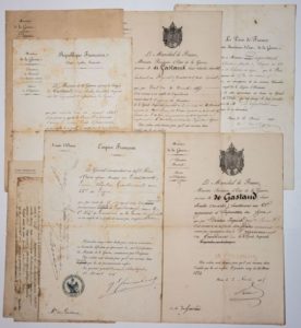 (ARMÉE D'ORIENT) PAPIERS MILITAIRES de Louis Charles Auguste Anaclet DE GASTAUD Capitaine ; 8 Pièces in-folio (1837/1858): 1) Acte d'engagement 1837 à AIX (13) - 2) Sergent au 61° Régiment d'Infanterie de Ligne - Avis de Nomination comme Chevalier de la Légion d'Honneur, P.S. MONTHYON Ministre de la Guerre - 3) Certificat de Chevalier de la Légion d'Honneur, P.S. Vicomte de SAINT MARC 1846 - 4) Sous-lieutenant, 17 avril 1848 - 5) Lieutenant au 61° Régiment de Ligne, 1852, P.S. du Maréchal de SAINT ARNAUD - 6) ARMÉE D'ORIENT, Nomination provisoire de Lieutenant dans le 1er Régiment de Grenadiers de la Garde Impériale; Q.G. devant SÉBASTOPOL 11 mars 1855; P.S. du Gal CANROBERT (futur Maréchal); cachet “Le Comm. en Chef de l'Armée d'Orient” - 7) Lieutenant au 1er Régiment de Grenadiers de la GARDE IMPÉRIALE; P.S. du Maréchal VAILLANT, vignette & cachet à sec, 1855 - 8) Nomination de Capitaine au 1er Régiment de Grenadiers de la GARDE IMPÉRIALE - P.S. du Maréchal VAILLANT, 1858; vignette & cachet à sec.