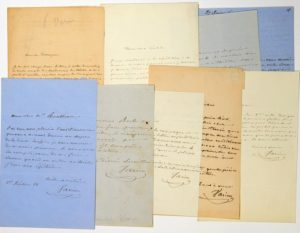 VARIN (Charles VOIRIN, dit Victor) Auteur dramatique français (NANCY (54) 1798 - Paris 1869). 9 LETTRES autographes signées entre 1840 et 1860 à son cher DESNOYERS, à M. LUBIN Bld du temple, à M. BECK Éditeur, à M. ROUSSEAU Régisseur, à M. ARNOL, à M. LUBIZE, etc... “Mon Cher DESNOYERS. Je me suis chargé dans le temps, à votre demande, de rendre compte des Vaudevilles du Théâtre de la Porte St Martin, et je suis surpris de lire aujourd'hui dans le journal, un article qui n'est pas de moi sur la Pièce d'Urbain le Manant, quoique le mien ait du vous être remis. Si vous avez donné ce théâtre à un autre Rédacteur, il me semble qu'il eut été facile et convenable de m'avertir de ce changement. Mais il faut mieux ne pas se gêner, c'est la politesse du SIÈCLE. Quoiqu'il en soit, j'ai à mon retour une demande à vous faire. Au lieu d'être payé article par article, ce qui, grâce aux coupures, rognures, réductions et supputations, se trouve amener à zéro. Au résultat, je désirerais, pour échapper à l'Arithmétique du SIÈCLE, avoir un fixe sur lequel je puisse compter. Je vous laisse à le déterminer... 20 Avril”.