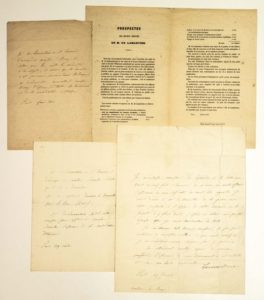 Alphonse de lamartine Poète, Romancier et Homme politique. (Mâcon (71) 1790 - Paris 1869). Trois Lettres de 1840 et une Lettre circulaire imprimée: Lettre A.S. et L.A. à Mr BERRY Chef de Bataillon, pour lequel il appuie sa demande + Lettre Autographe à Mr LACOMBE Percepteur. «Mr de Lamartine à l'honneur...» + Lettre circulaire imprimée de Mr de LAMARTINE du 1er Février 1849, recommandant le prospectus de ses «Œuvres choisies retouchées, augmentées, commentées et éditées par moi-même»