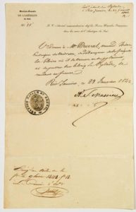 MARINE. BRÉSIL. Auguste Samuel MASSIEU DE CLERVAL, Vice-Amiral en 1842 (St Quentin/Aisne 1785 - Montpellier 1847). Pièce signée MASSIEU Le Contre-Amiral Commandant en chef les Forces Navales Françaises dans les Mers de l'Amérique du Sud (En-tête impr.). RIO-DE-JANEIRO ce 23 Janvier 1842. Cachet « Station Navale du Brésil. » - Ordre à Mr DUVAL Enseigne de Vaisseau de débarquer de la Frégate « La Gloire » où il se trouve en supplément, et de passer sur le Brig « Le Pylade » se rendant en France. (Embarqué à bord du "Pylade" à Rio-de-Janeiro le 23 Janvier 1842.) 1p in-folio.