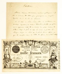 FAUX-BILLET Publicitaire de 1000 FRANGES de 1845. «Procédé FORTIER, teinturier apprêteur, 5 rue de Bouloi, à Paris.» (13 x 22 cm). Ancien condamné politique en 1832, FORTIER fait des établissements de Teinturier dégraisseur. Il émit ses Billets de 1000 Franges qui lui valu des poursuites de la Banque.