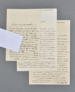 1834. « Si M. Dujardin [le naturaliste Félix Dujardin (1801-1860)] porteur de cette lettre, poussait jusqu'à Nice dans ses excursions sur les bords de la Méditerranée, dans le but d'étudier sur place et sur le vivant les productions zoophysiques de votre mer, vous m'obligerez bien particulièrement en le favorisant de vos conseils []. Après avoir étudié les zoophytes fossiles de la Touraine [Mémoire sur les couches du sol en Touraine et description des coquilles de la craie des faluns, 1837], il a facilement reconnu que pour passer à quelque chose d'un peu solidement établi, il en fallait connaître ce qui existe afin de les comparer avec ce qui a existé [] ». 1838. Il lui envoie un nouveau collaborateur « qui pendant son voyage sur la Bonite [circumnavigation de Vaillant en 1836-1837] avec vos confrères Mr Gaudichaud et Eydoux a montré par sa persévérance et sa sagacité qu'il est digne de marcher sur vos traces [] ». Il ajoute en P.S. « Ne pourriez-vous pas, si le voyage de la Bonite se publie un peu largement, obtenir d'y intercaler les matériaux que vous avez en portefeuille et que nous voudrions bien posséder ? ». 1840. Il répond à sa demande d'intervention auprès de M. Pitois, qui « pourrait s'arranger de votre ouvrage ».