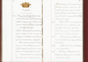 reliure cuir noir, sous une chemise de soie brodée vert et rouge, coins de velours pourpre avec passementeries, couronne brodée et perles sur le plat sup., cordelettes de fermeture. jOli Manuscrit calligraPhié, orné de 18 écus soigneusement aquarellés représentant les armes des seigneurs de Pomponne. Il raconte l’histoire du village, du château et du domaine de Pomponne ; il est enrichi de 4 documents anciens montés sur onglets. * nOBlet. L.A.S., Paris 7 juin 1662, à Simon Arnauld de POMPOnne, ex-conseiller du Roi en ses conseils, à Verdun (3 p., adresse avec cachets cire rouge aux armes, soies jaunes). Lettre au ministre disgracié pour le féliciter des couches de sa femme [naissance de son fils aîné, Nicolas-Simon], et l’entretenir de terres dont il est propriétaire, enclavées dans celles de Pomponne. * Simon arnaulD De POMPOnne (1618-1699, diplomate, ministre et secrétaire d’État aux Affaires étrangères). L.S., Versailles 27 janvier 1693, au R.P. Lemercier, supérieur du collège des jésuites à Amiens (1 p.). Envoi d’un mémoire pour répondre à sa lettre. * Nicolas arnaulD De POMPOnne (1662-1737, lieutenant général du Roi au gouvernement des provinces de l’Île de France, Soissonnais, Beauvaisis et Vexin). 2 L.A.S., dimanche 14 et mardi 16 novembre, à M. Barré, bailli de Pomponne, à Lagny (1 p. chaque, adresses). Envoi d’un papier, puis d’un mémoire, avec prière de faire de s’occuper de la publication d’héritages, et de la confection d’un terrier. « Mr de Pomponne avoit cette coustume de ne datter jamais rien »… Quelques autres documents joints, dont un exploit d’huissier au nom du prieur de Pomponne, Fondrier de Boisrevaux, contre Jean Gougibus, fermier du prieuré, et ses filles, 14 février 1750, à propos d’injures et outrages sur la voie publique.
