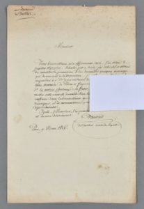 Ayant reçu le Jupiter olympien, il a « l'honneur d'écrire aujourd'hui à S. Ece [Son Excellence] pour réclamer de ses bonté 1°/ Le Voyage aux terres australes de Péron et Freycinet 2°/ Le voyage d'Ali Bey [] ».