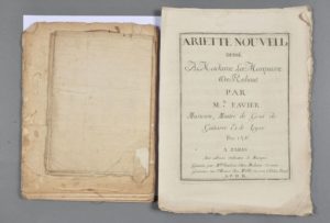 - Ariette nouvelle dédiée à Madame la marquise de Rohaut par Mr Favier, musicien, maître de goût de guitarre [sic] et de lyre. A Paris, aux adresses ordinaires de musique. In-folio, 4 pp. de musique gravée.