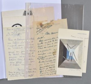 Jacques VILLON (voeux à Mario Avati), Léon BONNAT, Henri MATISSE (L.A.S. déchirée avec trou, enveloppe, mars 1939, « ce qui me bouleverse c'est qu'après 50 ans de travail, je me trouve contrarié dans sa continuation par ceux à qui j'ai le plus pensé et en somme ceux à qui il profite le plus »), Georges MATHIEU, Hans ERNI (petit dessin signé), Nicolas POLIAKOFF (en-tête du marchand de tableaux Ivan Nikolenko, vente d'une icône), Jean CORTOT (2 lettres), Enrico BRANDANI et Renée Yolande HAUSER (2 lettres), Roberto MATTA (manuscrit surréaliste illustré de croquis, réalisé sur un sac en papier Air France lors d'un voyage Paris-Rome : autour du point d'interrogation qu'il représente avec le point au centre à la manière d'un oeil (« le point au centre, centre de l'énigme saisit le vif ») ou remplaçant le point par la virgule (« la virgule d'interrogation est une interrogation provisoire », « le point au pied traine l'interrogation »), etc. Et au dos : « in-terro-gate ». L'interrogate est la porte de la tenue intérieure ». Albert LEBOURG (au commanditaire d'un tableau, 1896). Albert GUILLAUME (à Etienne Grosclaude, 1915 + 1 de son épouse). CAROLUS-DURAND (3 lettres amicales + 1 de son fils Pierre), Edouard DETAILLE (CVAS), Jean-Léon GÉRÔME (sur un rendez-vous avec Garnier), Alphonse de NEUVILLE (demandant à assister à une fête vénitienne).