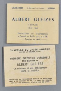 [Albert GLEIZES]. 2 cartes pour des expositions : « Première exposition d'ensemble des oeuvres d'Albert Gleizes, le cubisme et son dénouement dans la tradition » (Lyon, 1947) et « Albert Gleizes, peintures 1915-1948 (Avignon, 1950).